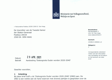 Eind april heeft minister de Jonge de Dialoognota Ouder Worden 2020-2040 met de resultaten van de veldraadpleging aan de Tweede Kamer verzonden.