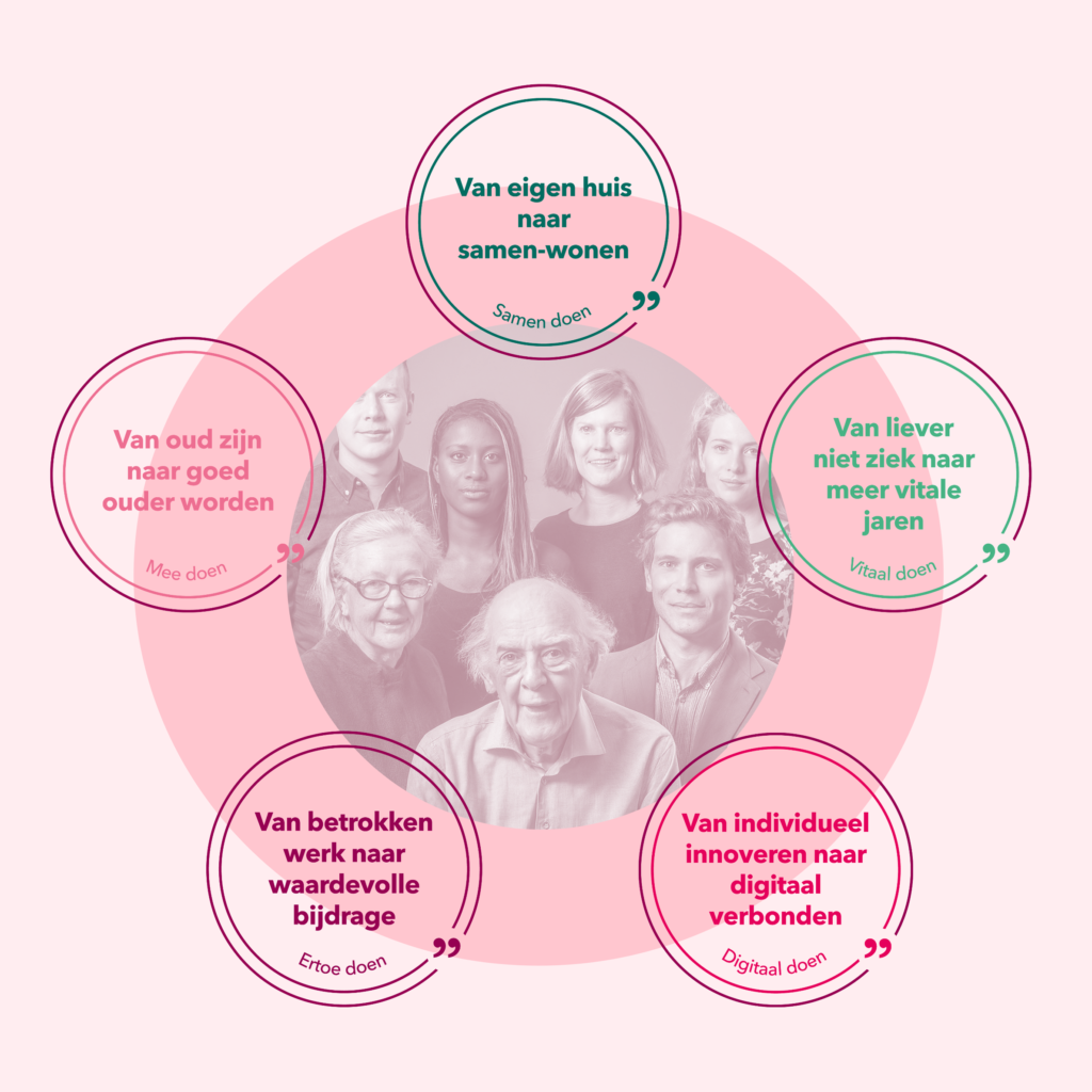 Een samenleving waarin iedereen, ook mensen in de derde en vierde levensfase, meedoet en ertoe doet. In deze samenleving worden we versterkt in en aangesproken op ons talent en zijn we ieder op onze eigen manier van betekenis. We wonen veilig, duurzaam en betaalbaar in een leefomgeving die we gezamenlijk vormgeven, leeftijdsvriendelijk is en bijdraagt aan onze vitaliteit en gezondheid. Vitaliteit waarin we ook zelf veel investeren, met als resultante dat als we zorg en ondersteuning nodig hebben, die ook geboden kan worden, informeel en formeel. Technologie en digitalisering ondersteunt daarbij op een inclusieve, veilige en betrouwbare manier. Deze visie op onze samenleving wordt in dit deel uitgewerkt aan de hand van de volgende vijf agendathema’s.